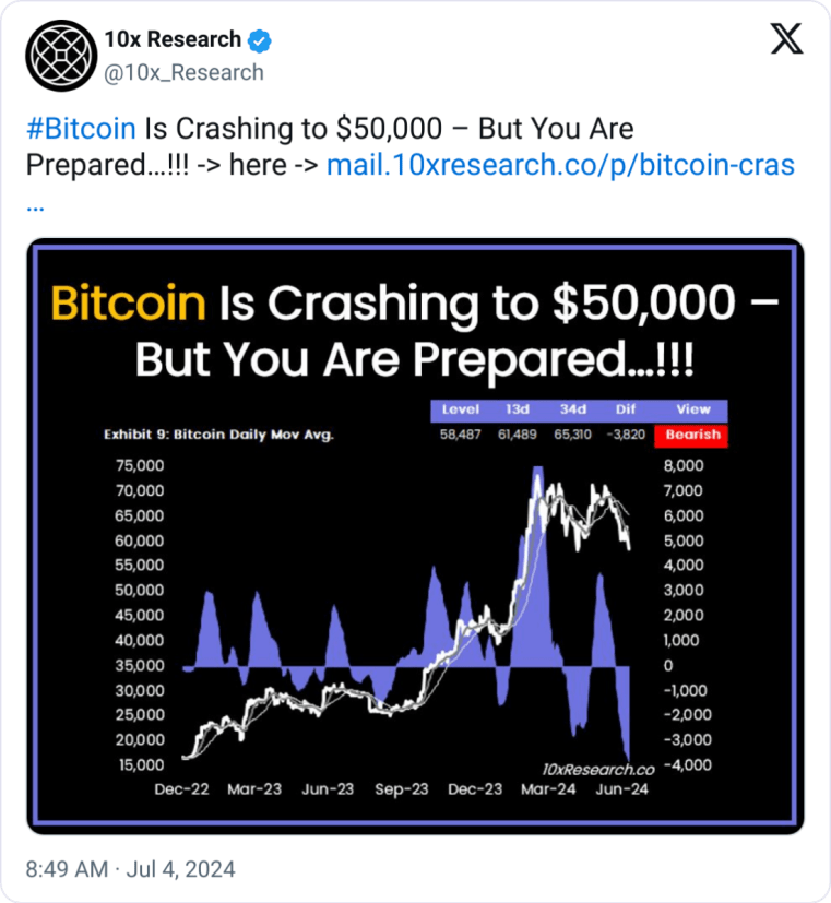 10x Research analysts predict that Bitcoin is on the brink of a significant decline, potentially dropping below $50,000. As of July 4, Bitcoin’s price fell sharply from over $60,000 to $57,000. This decline marks a shift in market sentiment, which the analysts attribute to decreasing buy flows and increasing sell flows.